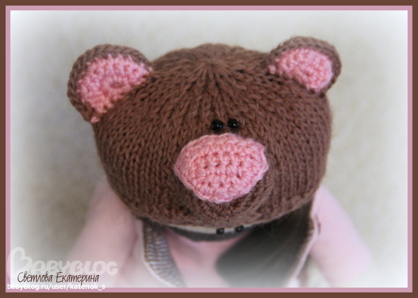 Вдохновилась я шапочками для малышей одной замечательной ББшечки http://www.babyblog.ru/user/lenta/nata3133 и родилась у меня вот такая малышка в нежных розово-шоколадных тонах. Рост малютки 45 см.
