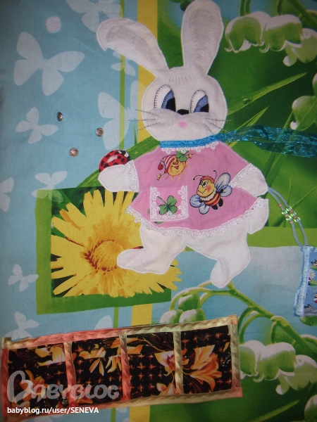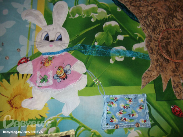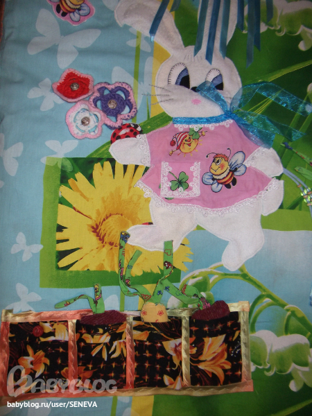 Зайка и орогод.Зайка из флиса, накладки на мордочку и и ушки - синтепон, платье из ситца, обшито кружевом, в кармашек можно что-нибудь положить, бантик на шее развязывается-завязывается. В правой лапке зайка должна была держать букет, но пока не доходят руки вышить стебельки для цветов. Цветочки связаны крючком, одеваются на пуговки. Огород - 4 кармашка, которые застёгиваются на пуговки. В грядку можно посадить 2 морковки и 2 свёклы, а потом собрать урожай.