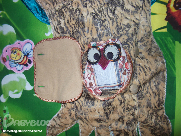 На спинке у Совушки липучка, чтобы садиться на ветку чудо-дерева. Крылья и хвостик на пуговичках, вертятся (не отстёгиваются), внутри синтепон.