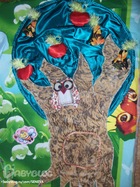 На нашем чудо-дереве растут сразу и яблоки (из атласа, внутри синтепон, листик из "травки", внутри одного из яблок бубенчик - Лруська трясёт яблочки, ищет с бубенчиком :)) и груши (из неизвестной мне плотной ткани, синтепон, "травка", в одной из груш целофан - шуршит). Яблоки на пуговицах (обтянуты тем же зелёным атласом), груши на кнопках.