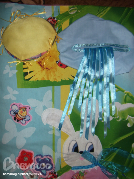 А теперь детально. Солнышко и тучка. Солнышко из прозрачной толстой плёнки, чтобы фото Лерочки не маралось, сверху закрывается солнышком, набитым синтепоном. Прошу дочу найти Леру, она пытается отодрать верхнее солнышко (развязывать ленточки пока не научились), а когда я ей помогаю, то показывает на фото и говорит: "Я" :))) Тучка объёмная, молния расстёгивается, появляется дождик из атласных ленточек.