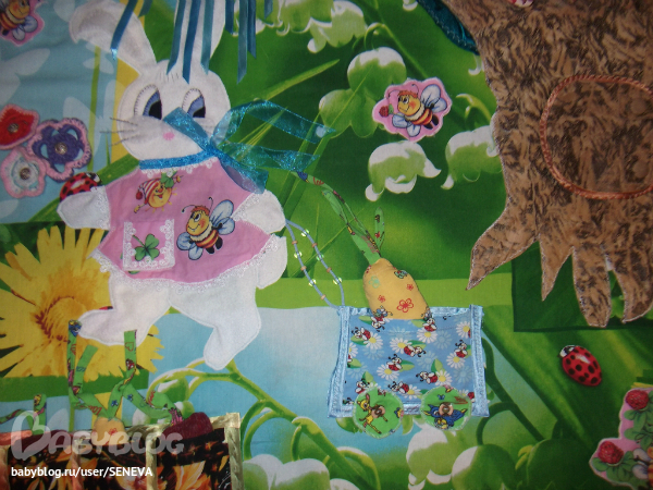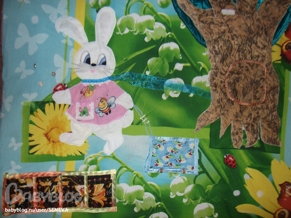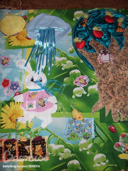 Коврик (размер 120*115 см) шила доченьке на ДР, играет с ним постоянно. Поэтому вот только сейчас получилось показать. Недавно благополучно пережил первую стирку (Ура! Я так этому рада :)). Некоторые идеи с интернета и ББ, заяц с тележкой полностью "мой" :) У нас такой нарисован на спинке стульчика для кормления, вот и приглянулся мне :)