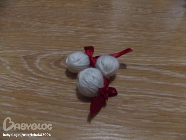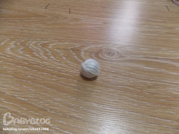 Затем клеем крепим кончик ниток для вязания к шарику и обматываем его, получается вот такой елочный шар: