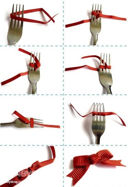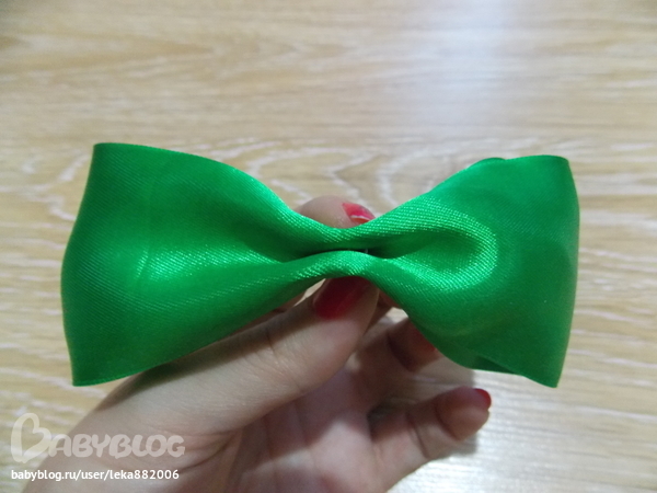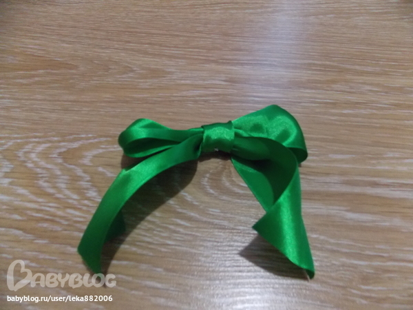 Одеваем это кольцо на бант, потом отрезаем еще кусочек ленты и протягиваем через кольцо позади банта, должно в итоге получиться так: