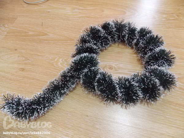 Потом обматываем мишурой все кольцо полностью, не слишком туго, расправляя мишуру:
