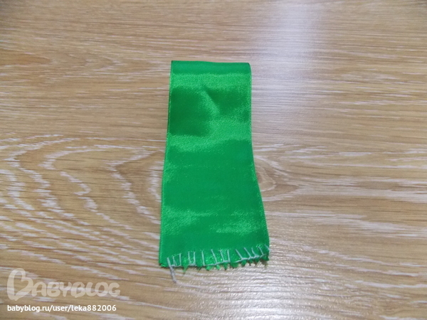 Далее делаем большой бант. Отрезаем кусок ленты и сшиваем его в кольцо: