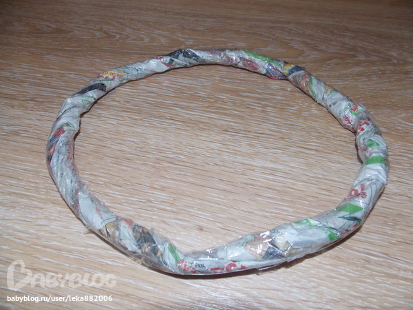 Сначала скручиваем из газеты жгутик, мне понадобилось 2, и обматываем их скотчем для прочности, потом тем же скотчем их соединяем в колечко: