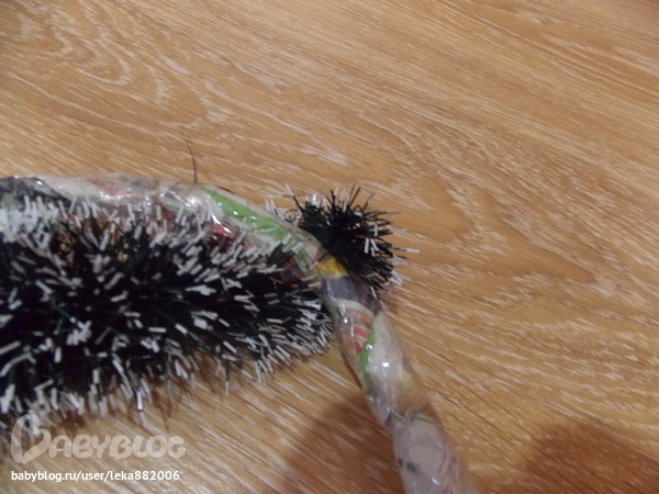 Дальше крепим кусочек двустороннего скотча на основу и к нему прикрепляем мишуру:
