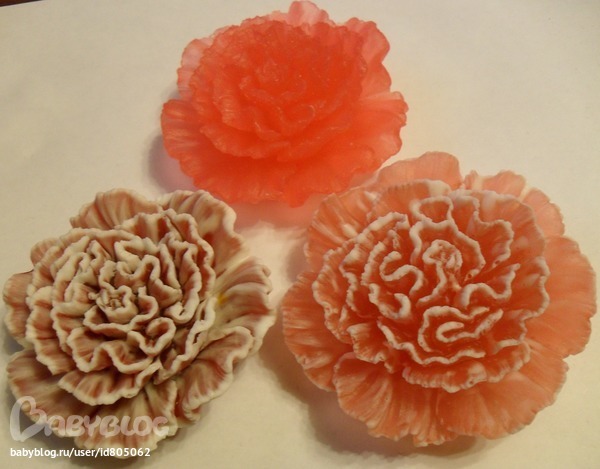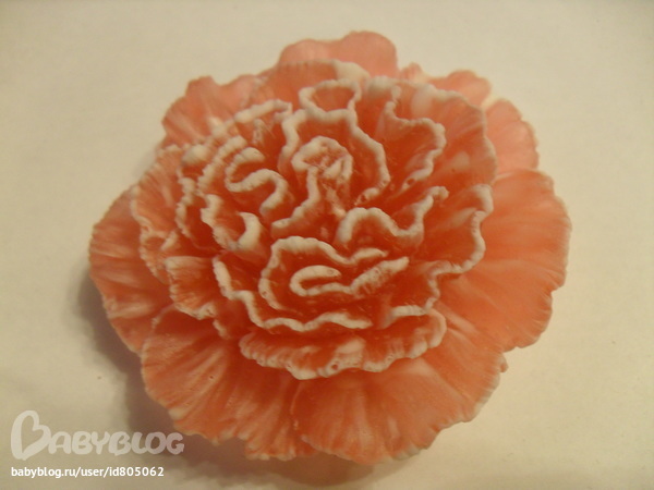 Мыло и косметика своими рукамиОчаровательная получилась гвоздичка. Очень понравилась моя новая формочка. Спасибо Екатерине( http://www.babyblog.ru/user/lenta/Katuten) . Увидела пост на ББ с гвоздикой и тааак себе захотела)) И вот теперь буду делать наборчики в едином стиле(гвоздика, роза, пион).