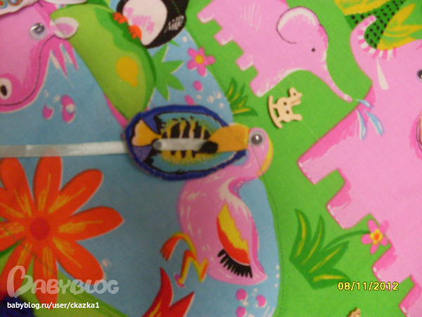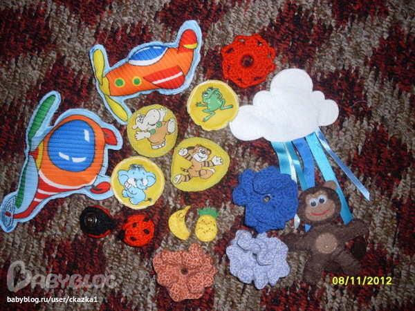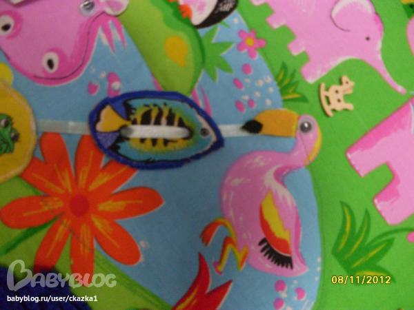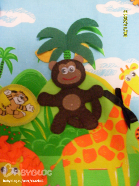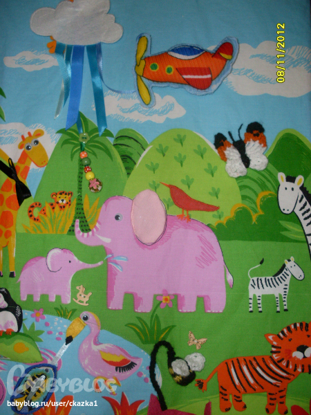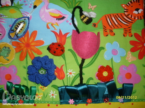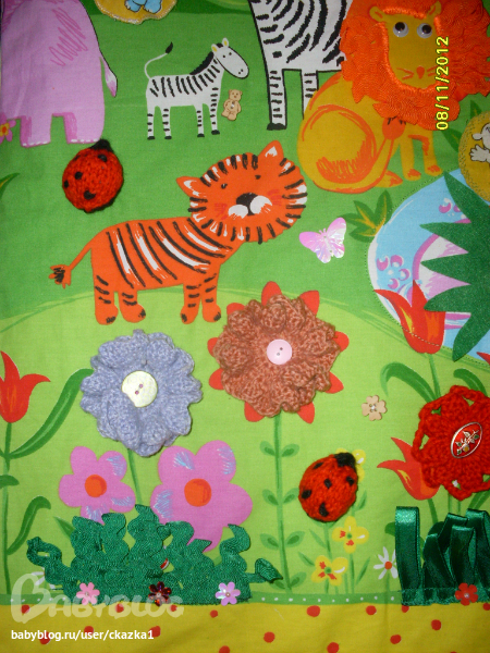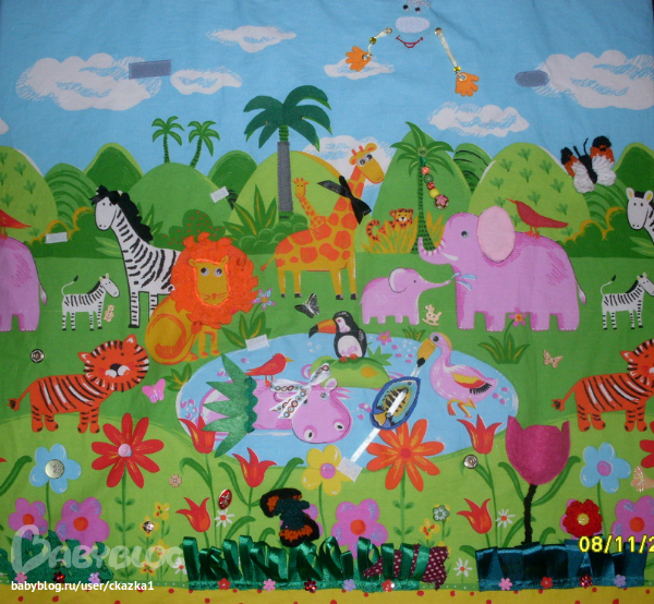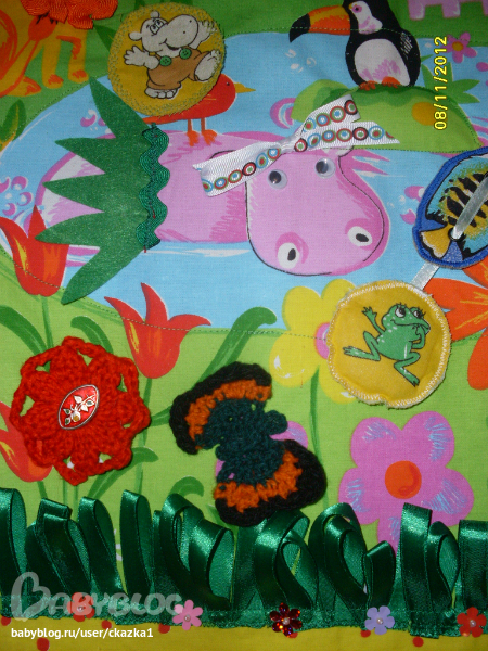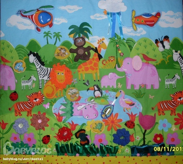 Для племянницы Олеси сшила коврик. Размер 80см * 75 см. Внутри поролон 1см. Я из этой ткани уже делала сынуле автопанно, так что многое уже было. Озеро шуршит, божьи коровки вязаные, крепятся на кнопках, вязаные цветочки снимаются с пуговок. На маленькой пальме на ленточке бусины и бубенчик. У малышей игрушки-пуговки: у зебры-мишка, у слона - лошадка. У тучки дождик убирается. Бегемотиха в юбочке из фетра, а бантик можно развязать и завязать. Расшито пайетками. Вертолет и самолет на липучке.