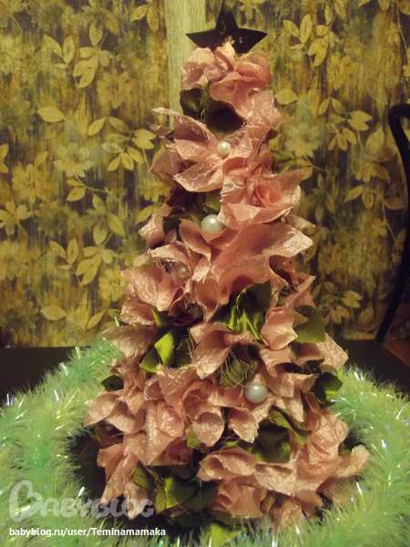 Мне тоже кажется, что не хватает макушки. Может какой-нибудь шарик из такого же материала, только поярче (вместо звезды). А сама по себе она очень красивая, пышная а с фольгой, бусинками или мешурой будет слишком много акцентов. Хотя может и правда на макушку маленькую звездочку прикрепить из соленого теста или детской массы для лепки и украсить ее стразами, или блестками посыпать, тогда она сразу станет новогодней! P.S. Вообще она и так красивая, я бы такую не смогла сотворить.