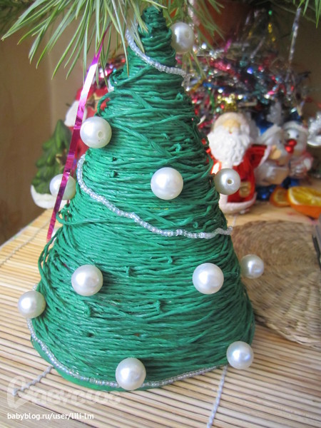 на конус (взяли колпак)-намотать шпагат или бичевку(клей брала момент, пва не держит), потом краской акрил.зеленой в 2 слоя.потом распустила старую резинку с бисерами-и нить эту приклеила+шарики из бус)