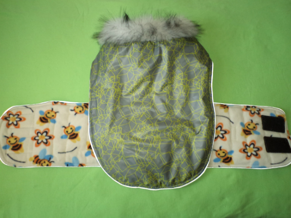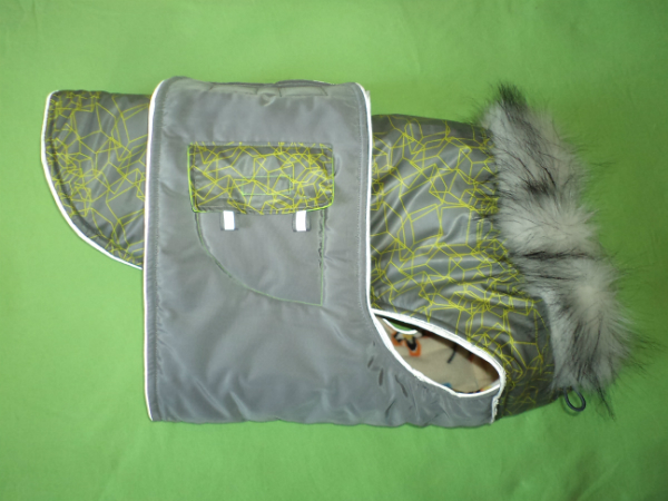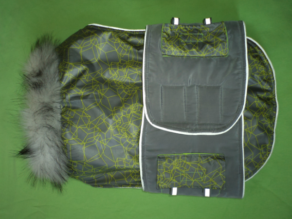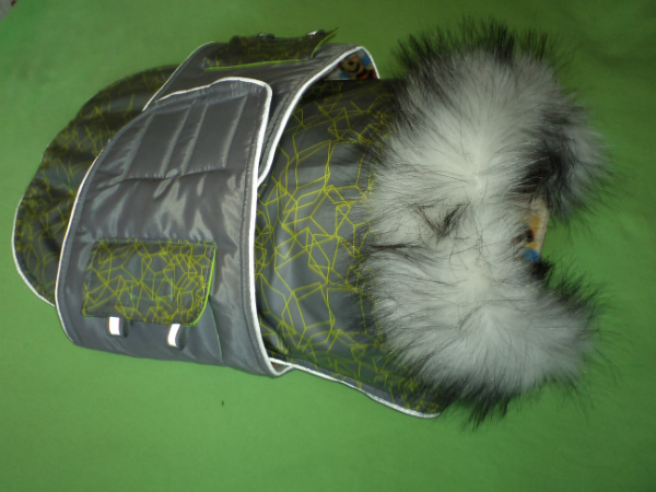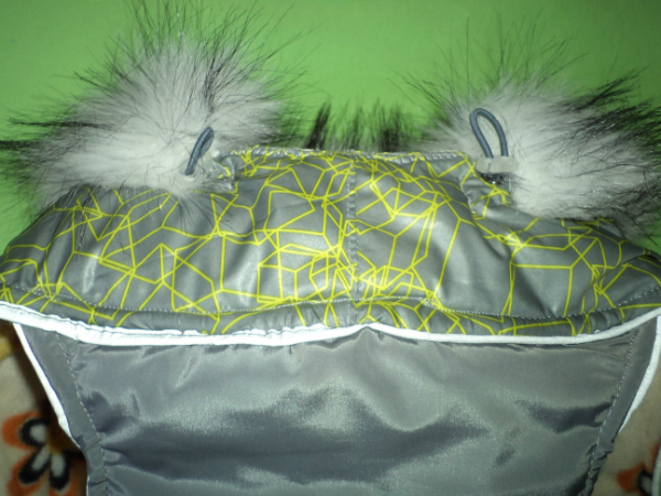 Фальш карманы. На спине застёжка велькро. Воротник искусственный мех,под ним кулиска со шляпной резинкой на фиксаторах.