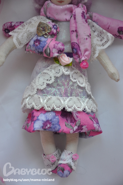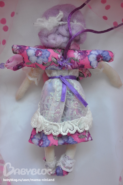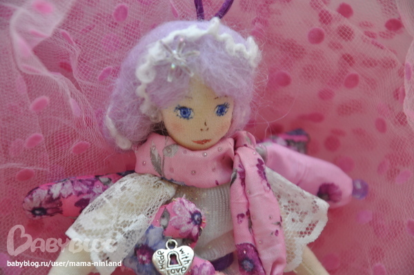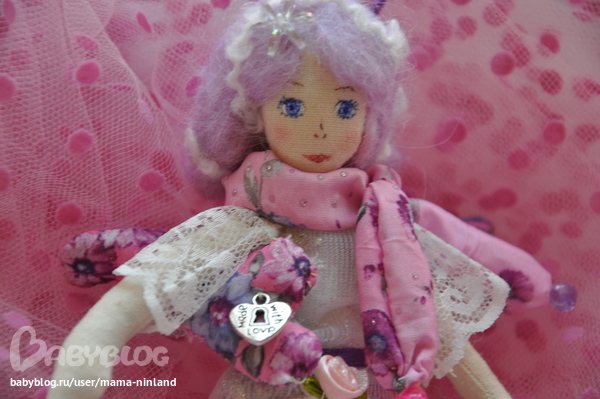 доработалась моя куклёна, любимая, лилово-лавандовая! с нежно-сиреневыми волосами, с цветастым сердцем-подушечкой, в воздушном шарфике, праздничном белоснежно-лиловом кружевно-блестящем наряде, украшенном розочкой, бусинами, блестками!
