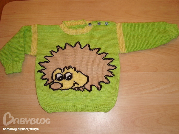 Афигительный получился свитерок!Ну.а ёжик-это моя слабость)Как тебе удалось его вывязать?Позитивный цвет свитерочка и ёжик-супер!