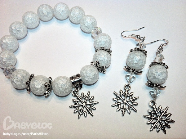 У меня через пару дней похожий браслет будет)))) Бусины из хрусталя еще остались. Подвеска снежинка лежит)))))) Жду резинку и начну собирать в комплект к предыдущему))))))