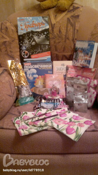 . Красивые салфеточки и кисточки для декупажа. Три книжки с рецептами: десерты из фруктов, пицца и пироги (и как только угадала, что люблю возиться иммено с десертами и выпечкой) и праздничные закуски. Набор прихваточка+прихватка-пречатка. Как раз кстати. Чай (мне показалось, что с фруктовой ноткой) и кофе в зёрнах (такой запах). А к чаю и кофе много сладостей: пастила, шоколадки (мужа от них отгоняла