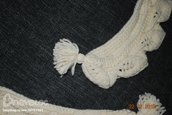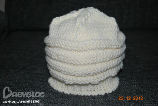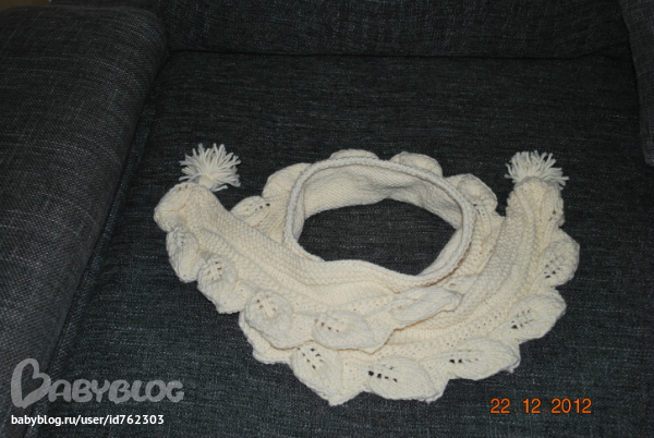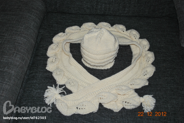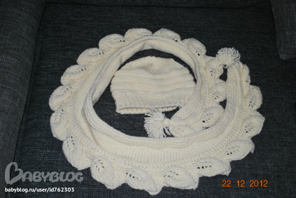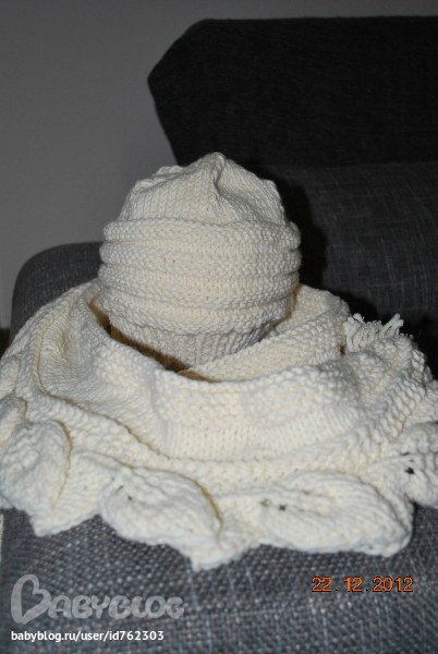 То ниток мало, то шапка ни как не получалась, вернее получалось но не то.Вроде пока мне нарвиться результат-хочу подаритъ своей сестре у неё в январе день рождения.Комплект связан из толстой пряжи 50% шерсти ,50% полиакрила.Спицы 7,5.