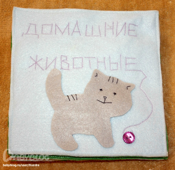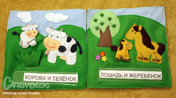 Все "мамы" пришиты к страничке, а объёмные "малыши" съёмные на липучках. С ними можно играть отдельно или искать каждому свою маму, находить большого и маленького.