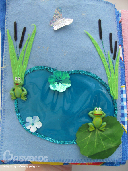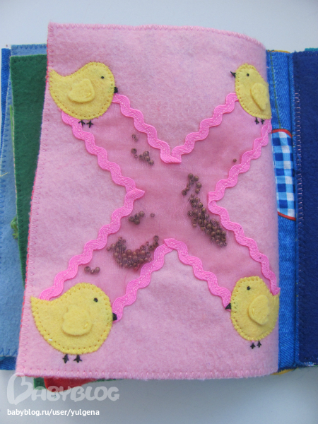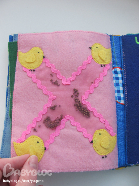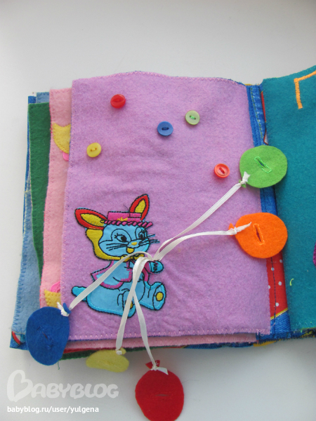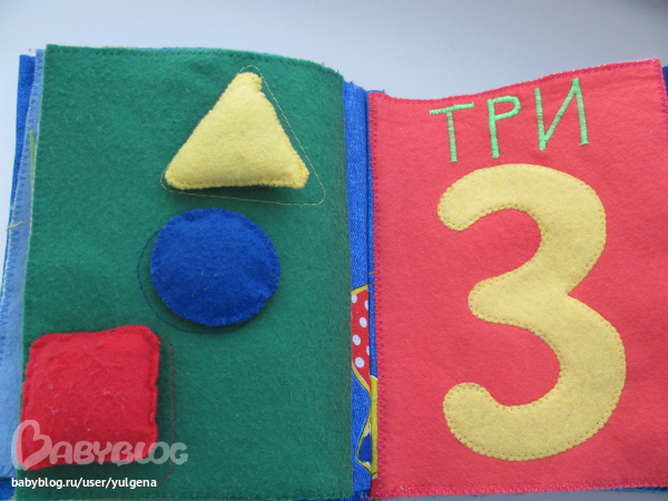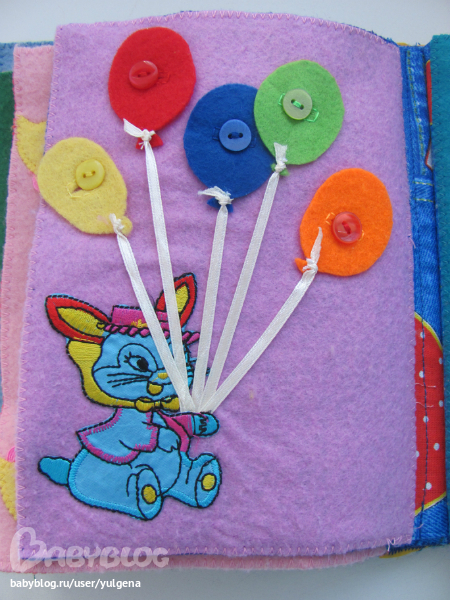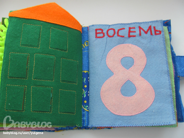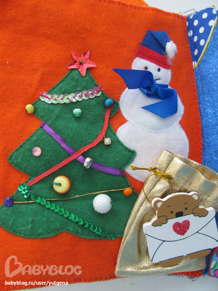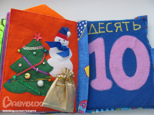 Десять - новогодняя тематика, т.к. ДР у нас в новогодние праздники (а шилась книжка, напомню, на годик). На елочке десять разных бусинок-игрушек и гирлянды из тесьмы.