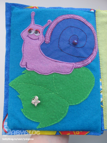 Первый разворот - цифра один. Улитка, в раковине улитки бусинка, которую можно катать. На листочке бабочка-пуговичка.