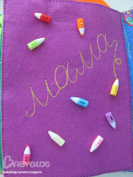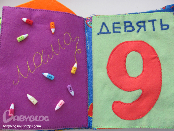 Девять - пуговки-карандашики разных цветов и первое слово"МАМА". Хотя можно было слово из девяти букв написать. чтоб выдержать тематику:)
