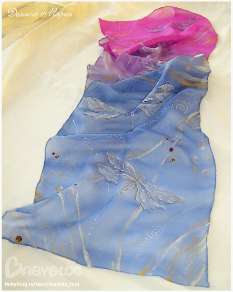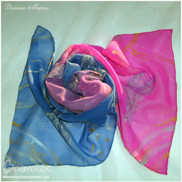 А вот шифон я только начинаю любить, и чаще использовать его для росписи. Уж очень, как мне кажется, капризный этот вид шелка :)