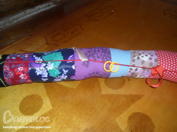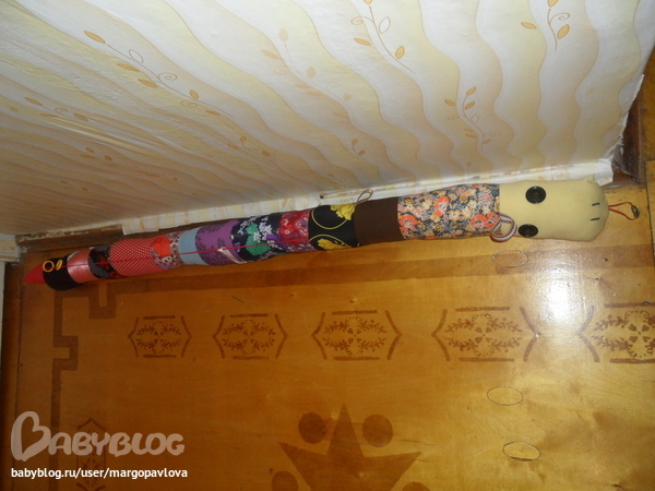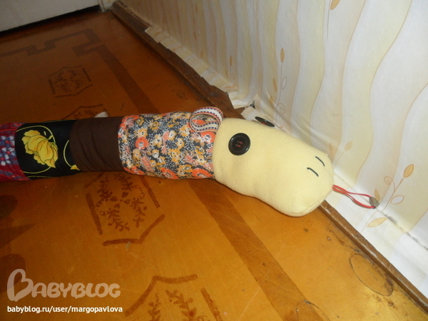 Поселилась у нас вот такая змея Анфиса. Сшита из разных на ощупь лоскутков ткани.