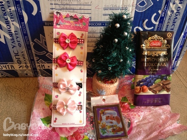 И вот ко мне тоже прилетела посылочка от девушки Светланы, http://www.babyblog.ru/user/lenta/s20071978, она мне прислала много-много-много кожи - буду что-нибудь изобретать )))). И еще мы получили новогодние подарки - елочку, шоколадку, магнитик и заколочки!!! Моя мамзелька просто пищала от заколочек - мы их тут же примерили))), магнит с Дедом Морозом (сейчас наша тема) - теперь всем расказывает что у нас в холодильнике (почему-то в, а не на)))) Дед Мороз живет. Шоколадку уже стрескали...... привет от талии )))) Ну а главное ............пабам - ЕЛОЧКА!!! Мы ее очень любим, даже уже запеленали разик, что говорит о большой привязанности (пеленаем только самые любимые игрушки). А вообще - дите когда это все увидела - сказала - мама, как всего много..... я тебе помогать буду цветочки делать.