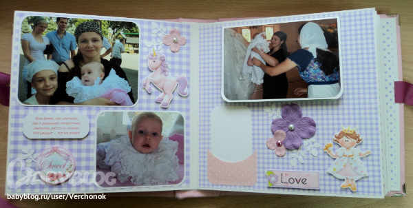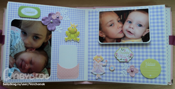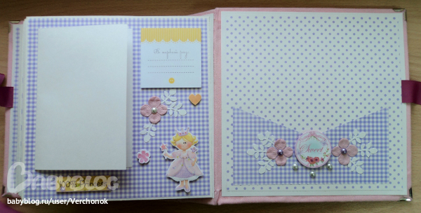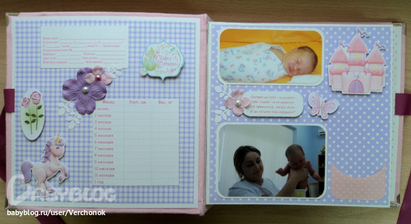 СкрапбукингЯ с новым альбомом (вернее, их два... Но об этом позже). Альбом для маленькой принцессы Анны, 8 разворотов, мягкая тканевая обложка (на ней ещё будет фото в рамочке, заказчица сама сделает - пока нет подходящей фотографии). Есть таблички для записей данных при рождении, табличка рост-вес, достижения, кармашек для диска или невместившихся фото. Последние две странички без фото. В общем, смотрим)