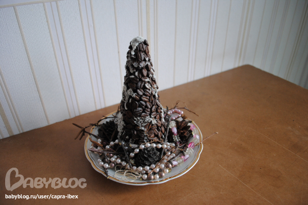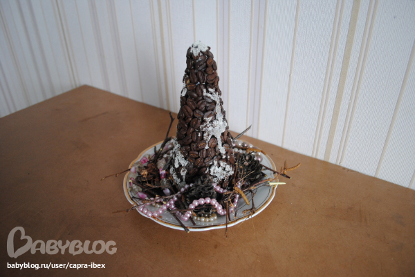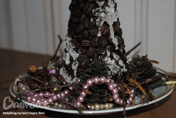 Сделала я елочку из кофейных зерен! Так как в этом году большой елки у нас в доме нет, пусть будет хоть эта. Зерна приклеивала долго, клеила на ПВА, хрупкая, блин, получилась, ударишь чуть-чуть - она вся осыпается... Но я довольна!!!! Стоит теперь на кухне - радует меня своим дивным ароматом... Эх, Новый год настает....