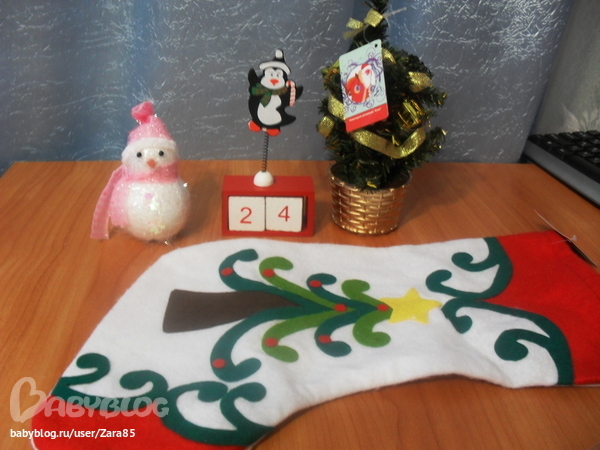 Наши новогодние подарки, папе одали елочку на работу , каклендарь поставили рядом с компьютером, а в сапожок обязательно дедушка мороз принесет подарочки, снеговик занял свое место с дедом мороз под нашей елочкой