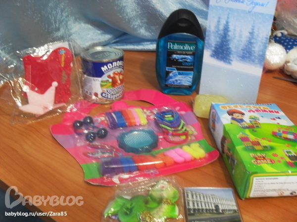 Папочке нашему гель для душа, мыльце тоже мы ему презентовали, но больше всего он обрадовался сгущенке, пошел сразу ее пробовать. Очень вкусная, ням-ням. Девченкам мои м конструктор, резиночке и класнная заколка корона в которой мы уже ходиди на елку к сестричке в садик. Магнитики заняли свое место на холодильнике.