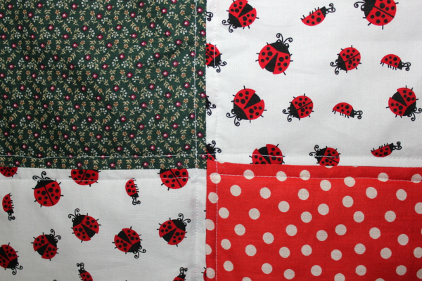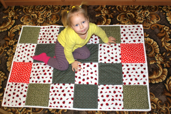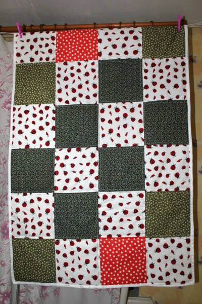Простынь как пеленочка - из одного куска ткани (из маминых, советского времени, запасов). Покрывало трехслойное: снизу белая бязь, сверху узор из квадратов, в середине синтепон. Размер готового - 80х120 см. Получились цвета новогодние, а рисунок вроде как летний :)