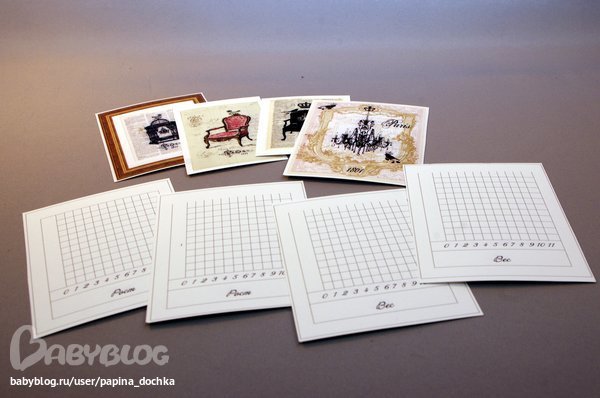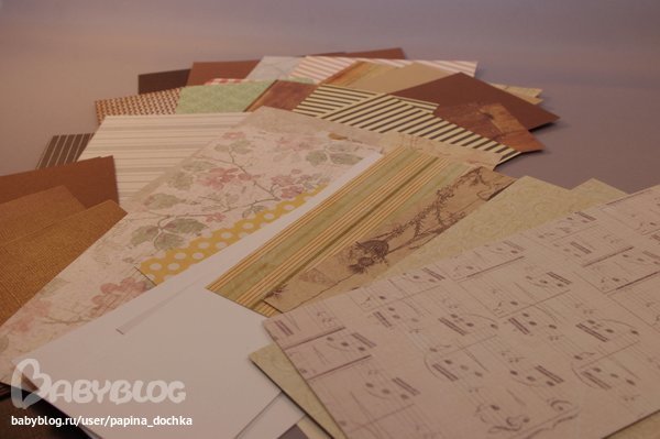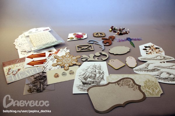 много-много бумажки для подложек, разная-преразная вырубка, картинки для вырезания, 2 набора натирок и 1 набор наклеек, чипборд, полужемчуг, пайетки, цветы, листья, картинки для вырезания распечатанные на прозрачной плёнке, рамочки, ленточки, шнурочки, 2 алфавита с цифрами (наклейки и вырубка), брадсы, рафия, кружево, надписи на вырубке по просьбе заказчицы, графики роста и веса детей.
