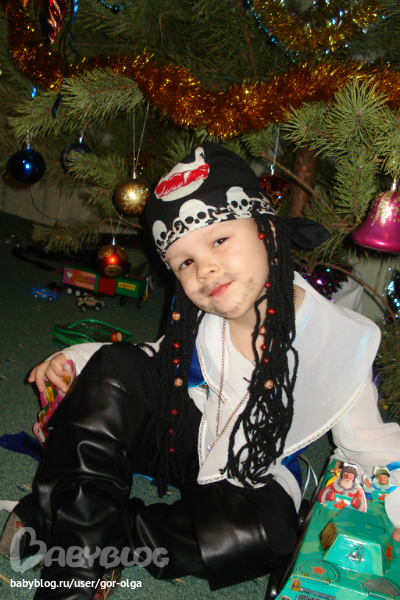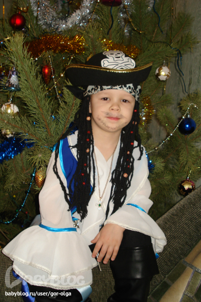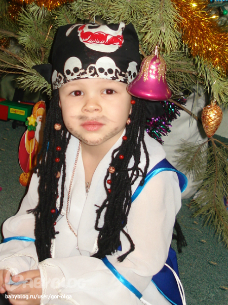 "Волосы" у пирата косички из пряжи.. бандана и шляпа покупные, только на шляпу наклейку распечатала на принтере. Блузку перешивала из своей блузки.. все равно ее не носила. Сапоги из страой папиной куртки - они, кстати, у нас универсальные под все костюмы.