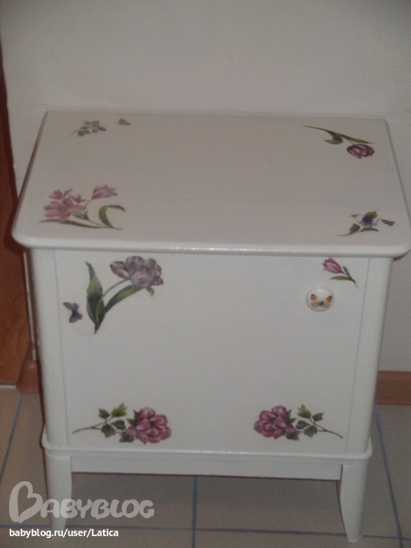 да, лакированная,я её сначала зашкурила насколько терпения хватило.хотелось основную грязную работу сделать пока ребенок спал,поэтому сошкурила лак не полностью, но так чтобы сцепление было лучше.белой масляной краской красила, но она долго сохнет, отец на будущее посоветовал воспользоваться нитроэмалью-должна сохнуть быстрее...хотя тут полазила-все акрил используют в основном