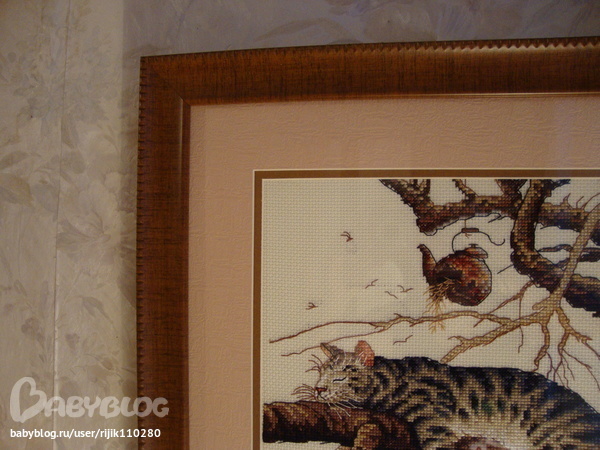 Супер!!! А я оформлять года через 3 буду)) Обещала дочке его к поступлению в школу подарить))) Татьян, мы с вами прям в тандеме вышиваем)) Я тоже сначала этого кота вышила, потом Викторианский шарм начала, щас половину уже отшила)))