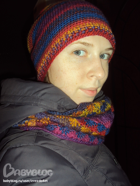 Спасибо! Нитки ЯрнАрт Мэджик 100% шерсть, 200м 100г, на снуд ушло почти 2 мотка. По петлям не подскажу, я их не считала) Просто набрала до нужной ширины и все) Вяжите, это суперпросто, а по удобству - так для меня самый лучший шарф, уже второй за эту зиму)))