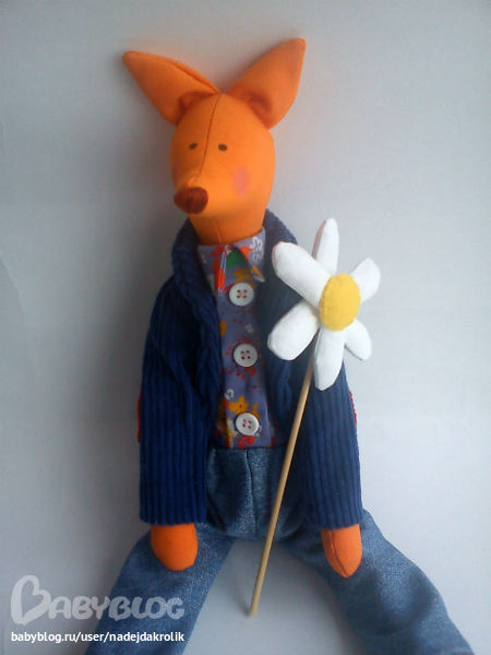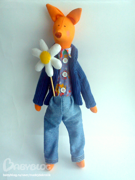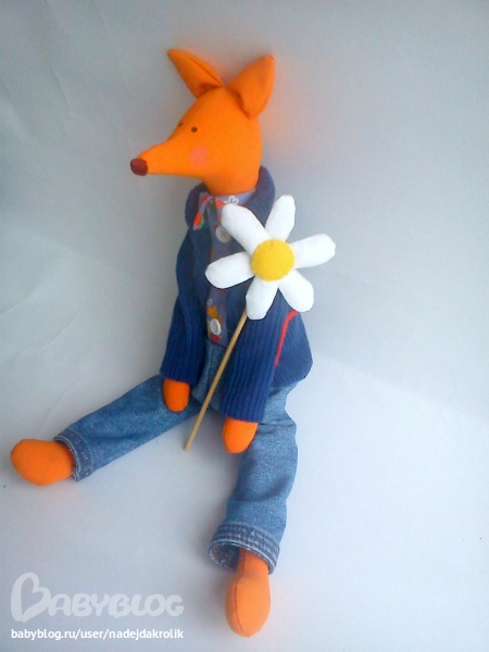 Так вот про лису)))Заказ звучал именно так: лиса с ромашкой. Получилась самая нетильдная из моих тильд))) Лиса портретная, костюмчик схож с одеждой заказчицы. Сшита вручную, рост примерно 38см.