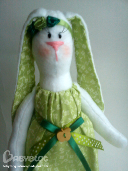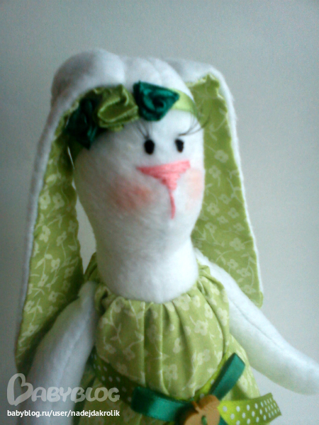 После новогодних красок хочется чего-то простенького, нежного. Вот такая весенняя зайка сшилась. Мой первый опыт шитья из флиса, впечатления двойственные, из габардина шить дольше, но приятней. Рост заюшки 33 см, сшита вручную.