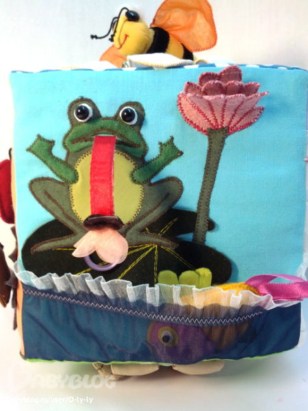 Лето. Лягушка прячет язык,если потянуть за колечко,на нем мушка. В воде-кармане прячется рыбка-погремушка. Лист и цветок кувшинки объемные.