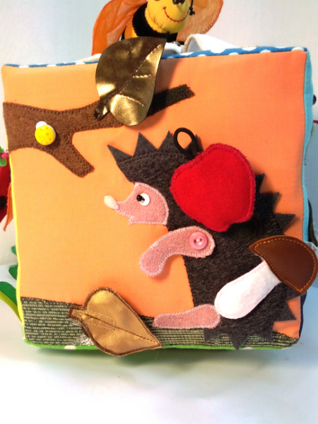 Осень. У Ежика на спине липучки,на них цепляюся яблочко(наполнено разными бусинами,вешается на ветку за петельку), листик(шуршит), грибок(наполнен синтепоном)
