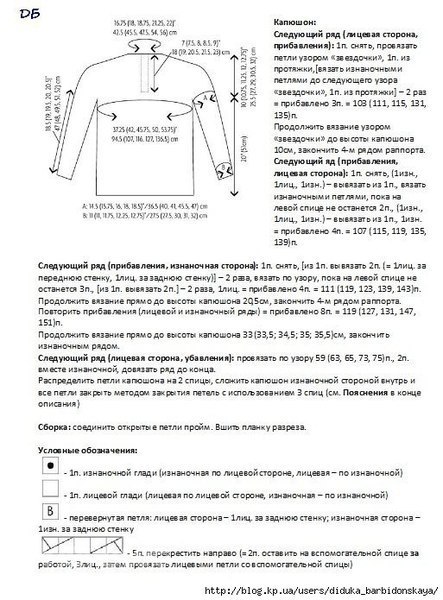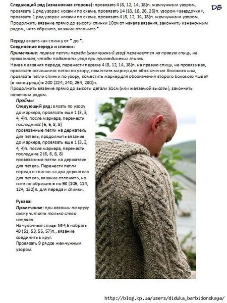 Черный ажурный пуловер Размер: М Вам потребуется: пряжа LANARO (10% акрил, 30% шерсть, 60% кашемир, 200 м/50 г) - 450 г черного цвета, крючок №3. Основной узор: вяжите по схеме.   Перед: наберите цепочку из 116 возд. п. + 3 возд. п. для подъема. Вяжите основным узором. Провяжите 1 раз с 1-го по 17-й ряд, далее повторяйте с 6-го по 17-й ряд. На высоте 51 см (= 57 рядов) начинайте вывязывать V-образный вырез горловины. Для этого в 58-м ряду оставьте среднюю петлю и на протяжении следующих 12 см (= 14 рядов) убавьте в общей сложности 23 п.   Спинка: вяжите аналогично, но с менее глубоким вырезом горловины. Для этого на высоте 60 см (= 68 рядов) от начала вязания оставьте средние 24 п. На протяжении следующих 3 рядов выполните в общей сложности 7 убавлений: 69-й ряд - 3 п., 70-й ряд - 2 п. и 71-й ряд -1 п. Закончите вязание детали. Рукава: наберите цепочку из 62 возд. п., вяжите основным узором. Провяжите 1 раз с 1-го по 17-й ряд, далее повторяйте с 6-го по 17-й ряд. Одновременно прибавляйте петли по краям для скосов рукава в соответствии с выкройкой. Всего с каждой стороны прибавьте по 19 п. Закончите работу на высоте 55 см (= 59 рядов) от начала вязания. Сборка: выполните плечевые швы, вшейте рукава, выполните боковые швы и швы рукавов. Вырез горловины, нижние края пуловера и рукавов обвяжите «рачьим шагом» (= ст. б/н слева направо). http://vse-sama.ru/vjazanie-dlja-muzhchin/chernyj-azhurnyj-pulover.html