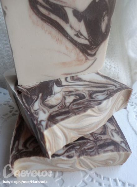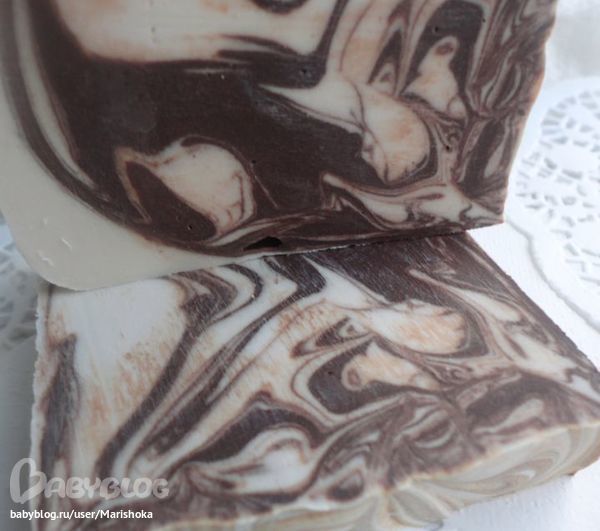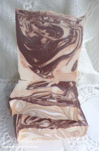 Мыло ооочень вкусно пахнет какао бобами, к ним я еще добавила аромат белого шоколада. Ммммммм.........