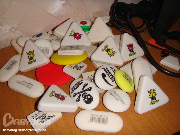 Увидела в инете идею с прямоугольными резинками-ластиками. И как всегда мысли поскакали: а пчему только с прямоугольными? Резинок в продаже сейчас много любых. Закупила всех форм и размеров: