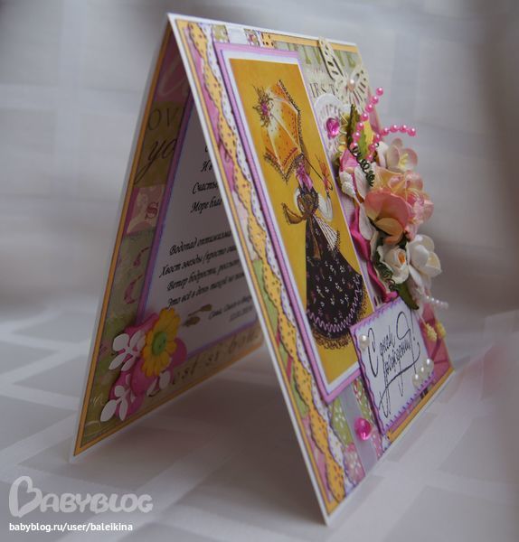 Ждём завтра в гости подругу, а у неё на днях будет день рождение. И так как открытка от меня ручной работы ещё не стала банальностью, то сделала вот такую открыточку. Светланка любительница розового, поэтому не могла я пройти мимо этого цвета, но добавила жёлтенького. Получилась вот такая яркая открыточка.