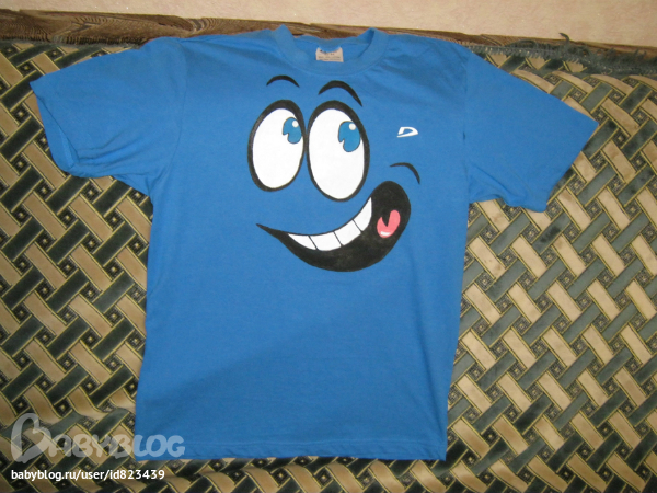 Рисую красками для ткани. А расположение рисунка выбрано такое из-за того, что футболка довольно длинная и адресована подростку (без живота), если одеть рисунок где-то на уровне пупка заканчивается