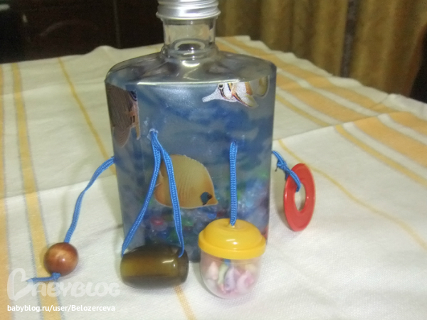 Сделала своему внучеку развивашку-перетяжку. Бутылочка обклеена витражной плёнкой-самоклейкой. В контейнере от бахил- бусинки в форме рыбки. В бутылочке насыпаны пластиковые бусины для шуршания.