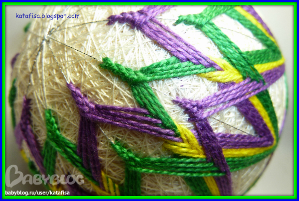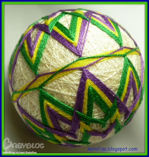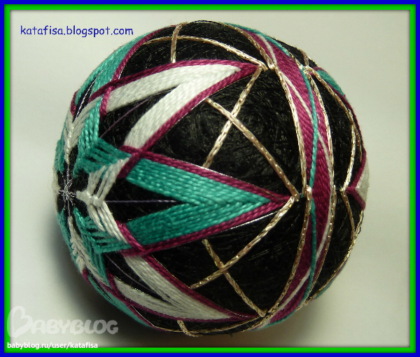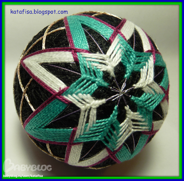 Который черный - это второй мой темарик, а первое фото - это моя самостоятельная работа - темари-погремушка. Косяки есть, много поняла чего, когда уже доплела, в общем, я на них подсела надолго)))
